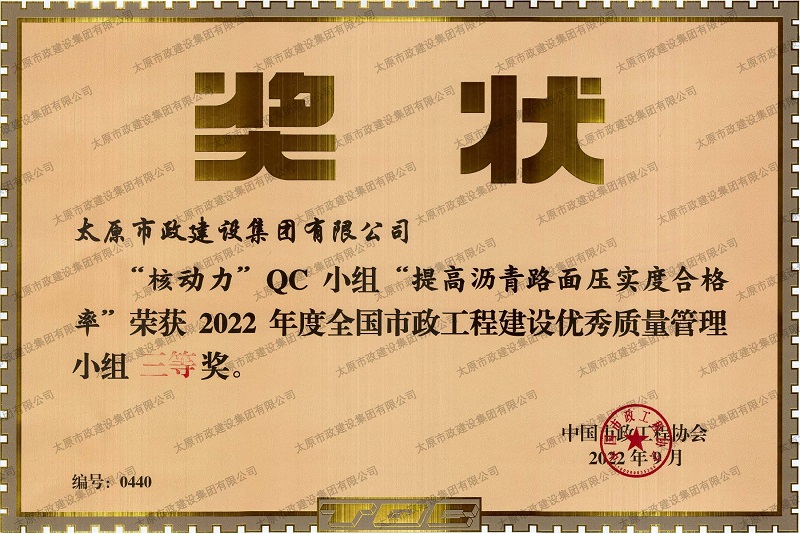 資質證書 營業執照 2022年度市政工程最高質量水平評價_H5-1路道路及配套工程(二標段) 2022年度工程建設誠信典型企業 中國施工企業管理協會_AAA級企業信用等級 2022年度全國市政工程建設優秀質量管理小組三等獎_''核動力QC小組”提高瀝青路面壓實度合格率”